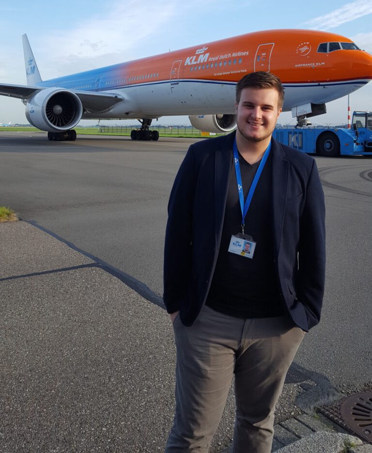 Direct na mijn terugkomst vanuit Duitsland, in maart 2017, was het tijd om af te studeren. Door mijn vele ervaringen naar het buitenland had ik een liefde ontwikkeld voor vliegen en internationaal werkzaam zijn. KLM in het bijzonder deed mijn trotse, Nederlandse hart sneller kloppen. Ik besloot de stoute schoenen aan te trekken, zocht uit hoe de e-mailstructuur van KLM’ers was opgebouwd, zocht naar managers via LinkedIn en zorgde er op die manier voor dat ik direct in de mailbox van de juiste persoon belandde, in plaats van bij HR op de grote stapel.